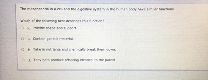 The statement that best describes the function of mitochondria is that they convert energy from food molecules into energy the cell can use. Which of the following statements best describes the difference between mitosomes and mitochondria. Find an answer to your question which best describes the function of the mitochondria.